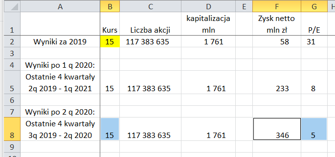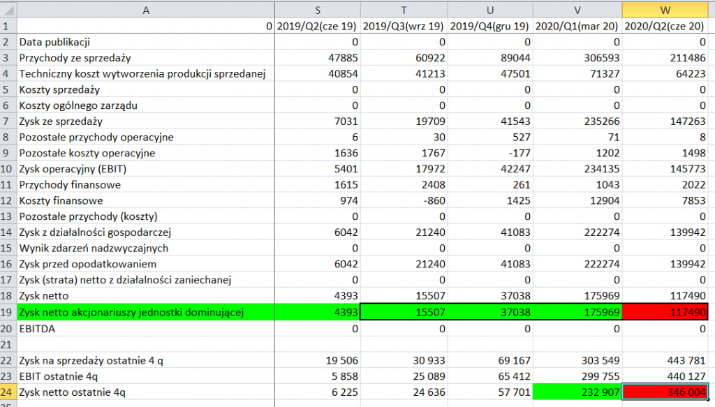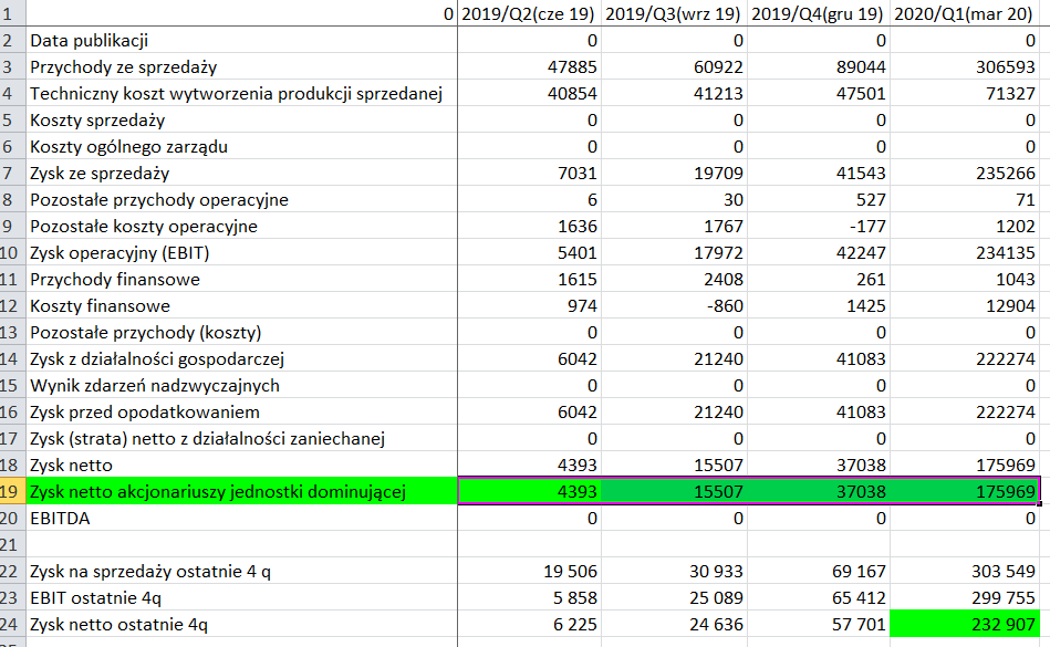 Aby to zrobić musimy wiedzieć jaki był zysk za ostatnie cztery kwartały po publikacji wyników za pierwszy kwartał 2020. Obliczenia w pliku Excel. Poniżej print screen. Na zielono wyniki kwartalne dla zysku netto. Plus suma ostatnie cztery kwartały: