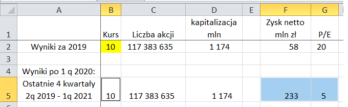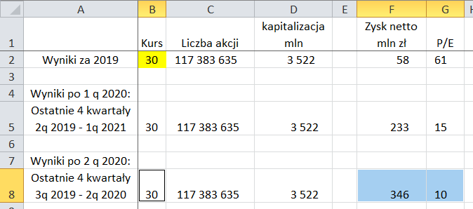 Gdy mamy zysk netto za ostatnie cztery kwartały możemy policzyć kapitalizację. A w efekcie mnożnik cena do zysku. Dodatkowo wrzuciłem zysk netto za 2019 rok. Mamy więc P/E dla wyników za rok 2019 oraz za ostatnie cztery kwartały licząc dla pierwszego kwartału 2020: